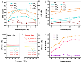 3a)屏蔽性能与刻蚀时间关系图;(b)单层MXene薄膜屏蔽性能与厚度关系图;(c)单层MXene薄膜和(d)堆垛MXene薄膜屏蔽性能与频率关系图;(e)堆垛MXene薄膜屏蔽性能与厚度关系图
