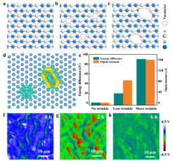 2 褶皱MXene薄膜中电偶极子形成。a理想晶体结构,b单原子Ti空位,cTi空位簇示意图。第一性原理计算中中dTi空位附近的电荷密度分布。e原始MXene和褶皱MXene之间的能量差和钛空位诱导的偶极矩。在化学蚀刻f0 h、g2 hh6 h时,褶皱MXene薄膜表面电位分布