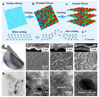 图 1 褶皱MXene薄膜的(a)-(c)设计思路和(d)实物图;(e-g)0、2、6 h刻蚀后的微观形貌;(h)透射电镜下褶皱薄膜形貌;(i-k)球差电镜观测Ti空位
