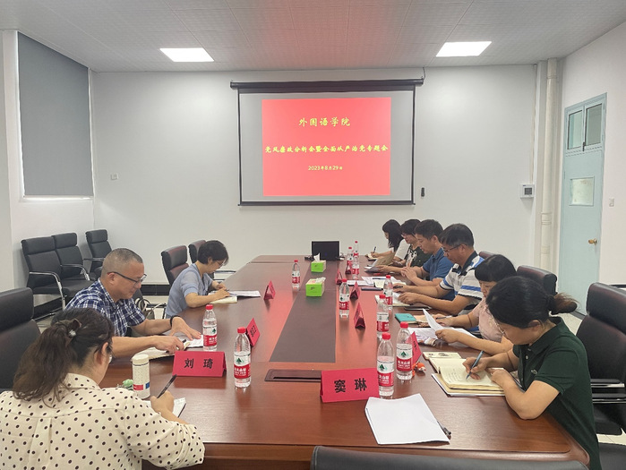 8月29日下午,外国语学院召开2023年上半年党风廉政建设分析会暨全面从严治党专题会议。会议以习近平新时代中国特色社会主义思想为指导,深入学习贯彻党的二十大精神和二十届中央纪委二次全会精神,全面贯彻落实主题教育“学思想、强党性、重实践、建新功”总要求,从严落实党风廉政建设责任制,进一步压实全面从严治党主体责任,深入分析、系统研判、重点研究存在的问题,并提出整改措施。校纪委委员、校办公室主任金涛到会指导,学院党委书记陈振华主持会议,学院党政领导班子成员、党委委员参加会议。